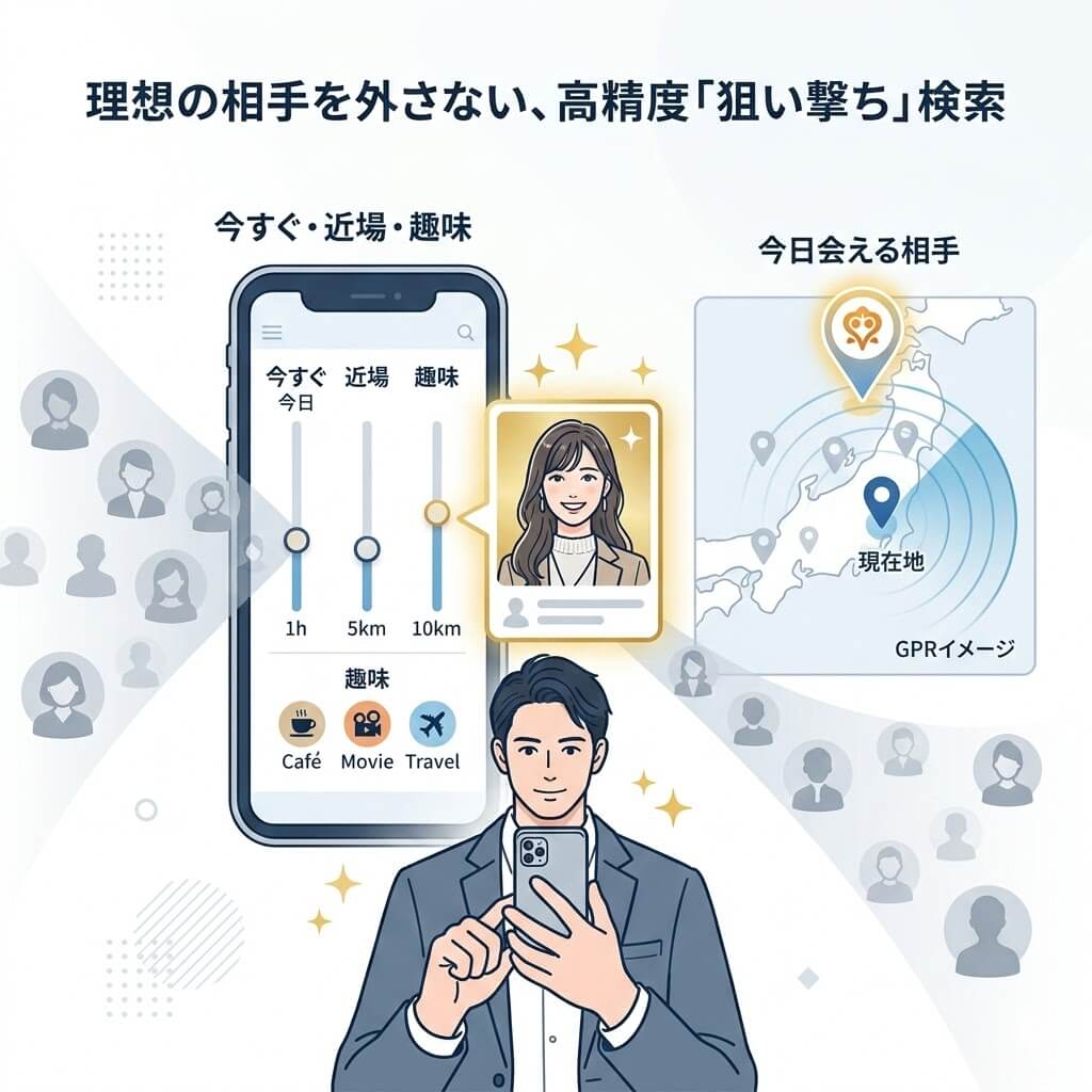 Jメールの検索機能は非常に細かく、年齢や居住地、体型といった基本スペックはもちろんのこと、「今すぐ会いたい」「週末ヒマ」といった現在のステータスや、趣味、目的(飲み友、恋人探しなど)からピンポイントで絞り込みが可能です。膨大な会員の中から、自分の希望にピッタリ合う相手を効率的に見つけ出すことができます。特に便利なのが「距離検索(GPS検索)」に似た地域絞り込みで、今いる場所の近くで遊べる相手を即座に探す際に重宝します。無駄なポイント消費を抑えるためには、この検索機能をフル活用して、アクティブかつ目的が一致する相手にのみアプローチをかけることが成功の鍵となります。細やかな条件指定は、効率重視のユーザーにとって大きな武器です。