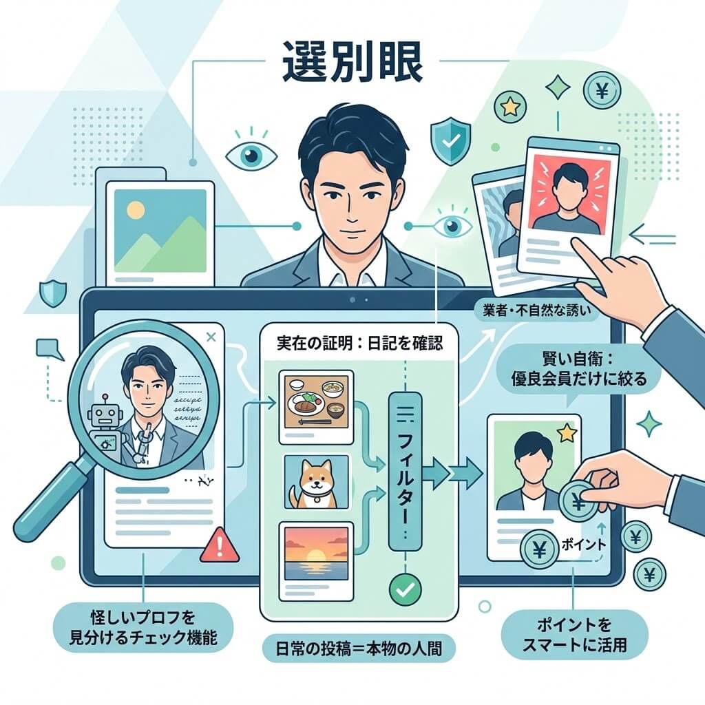 Jメールを利用する上で、中立的な立場として必ずお伝えすべき注意点があります。それは「業者」や、ポイントを稼ぐことを目的とした「キャッシュバッカー」と呼ばれるユーザーの存在です。これらは出会い系サービスの構造上、完全にゼロにすることは困難です。特徴として「プロフ写真が美しすぎる」「すぐにLINEなどの外部連絡先に誘導してくる」「メッセージを無意味に引き伸ばす」などが挙げられます。しかし、過度に恐れる必要はありません。前述の「日記」の有無を確認する、長文のコピー&ペーストのような不自然なメッセージには返信しないなど、基本的な見分け方を知っていれば簡単に回避できます。自衛の意識を持つことで、コストを抑えて優良なユーザーとだけ交流することが可能です。