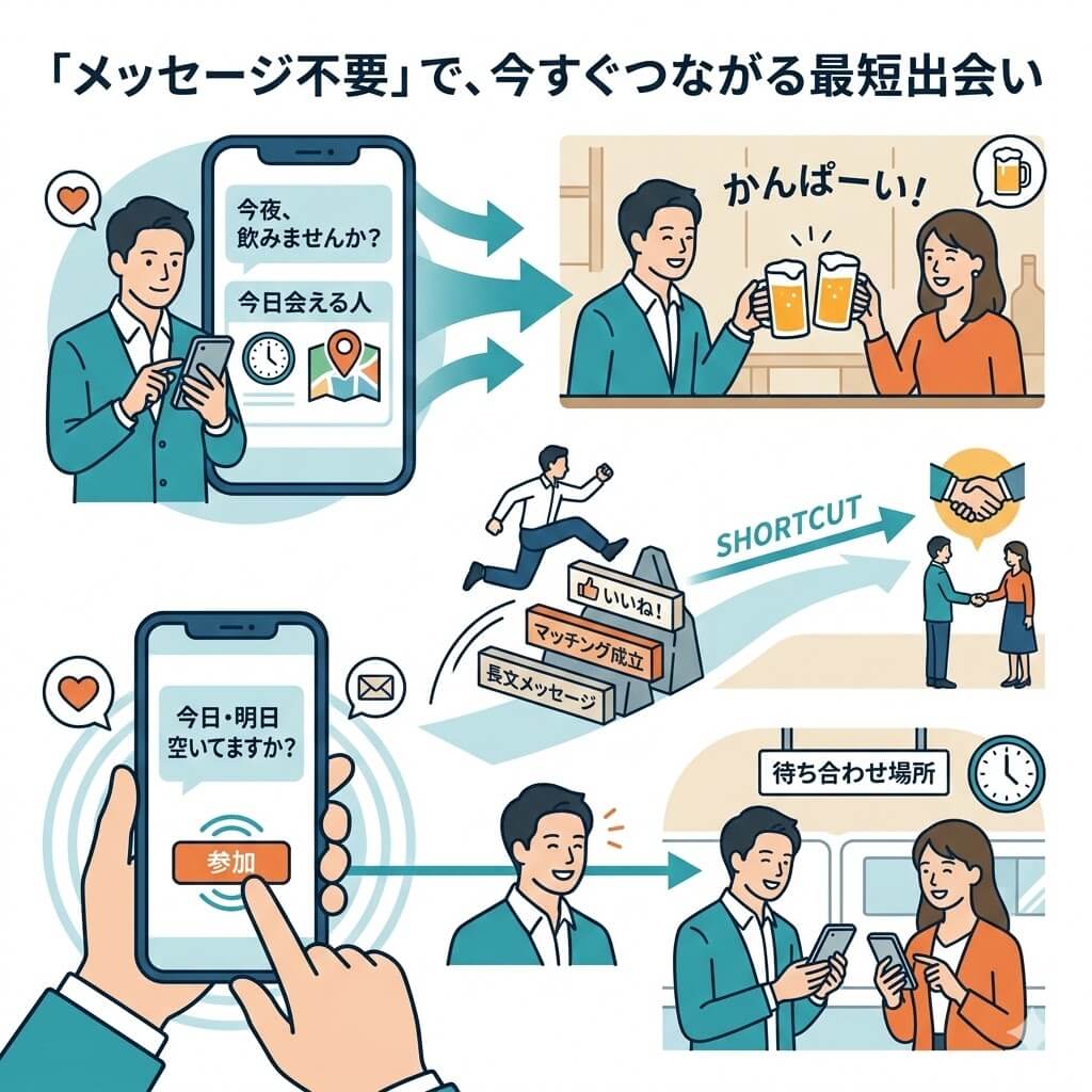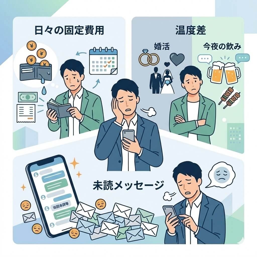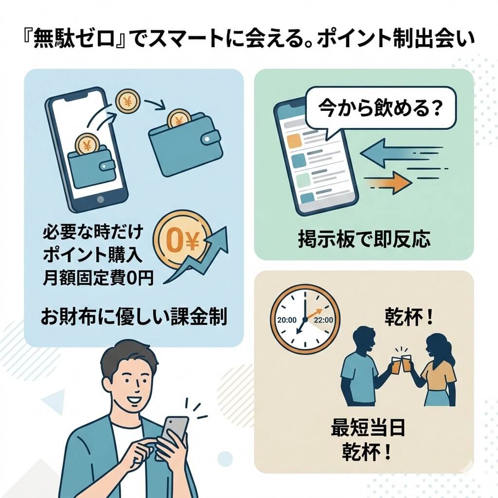 特に男性の場合、定額制アプリは「使わない期間」も容赦なくコストがかかるため、費用対効果が悪くなりがちです。また、婚活を前面に押し出したアプリでは、カジュアルな出会いを求める層との温度差が生じやすく、「今日暇だから誰かと飲みたい」といった突発的なニーズを満たすのは困難です。このような「重すぎる出会い」や「無駄な出費」への不満が、手軽なポイント制サービスへの移行を促しています。
