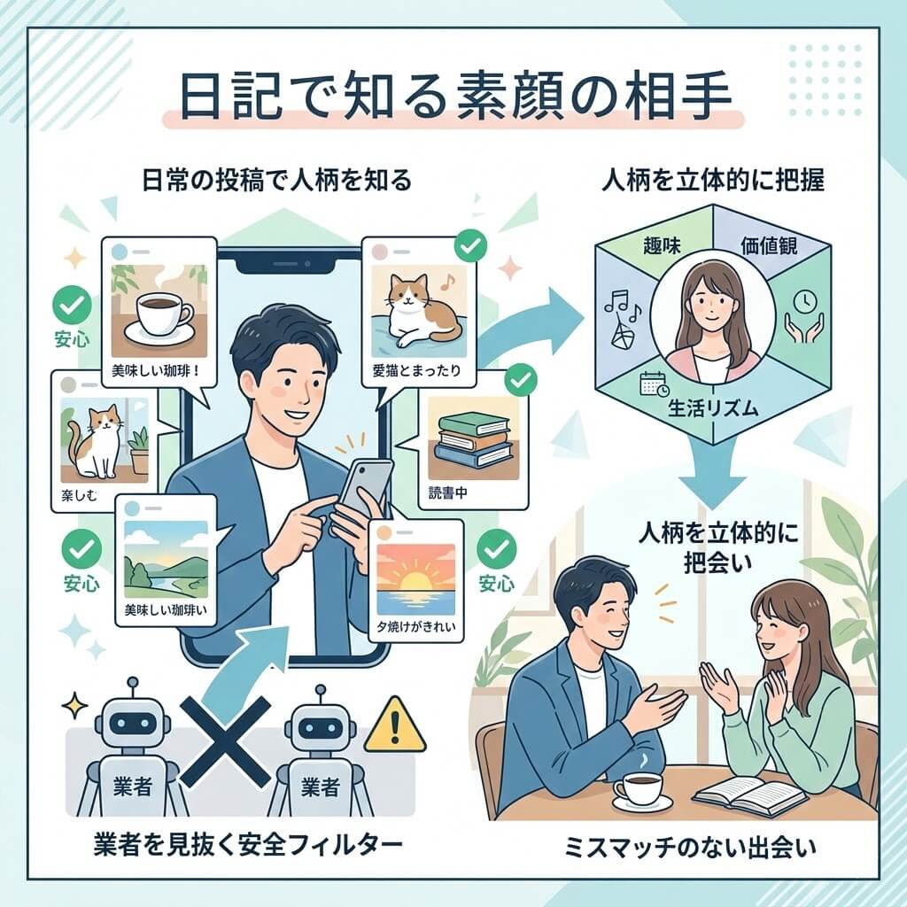 3、日記機能で相手のリアルな人柄を事前把握