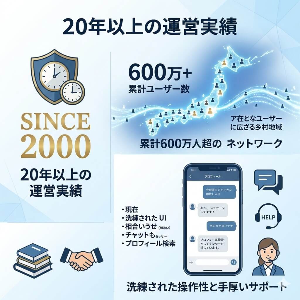 1、20年以上の運営実績と圧倒的な会員数