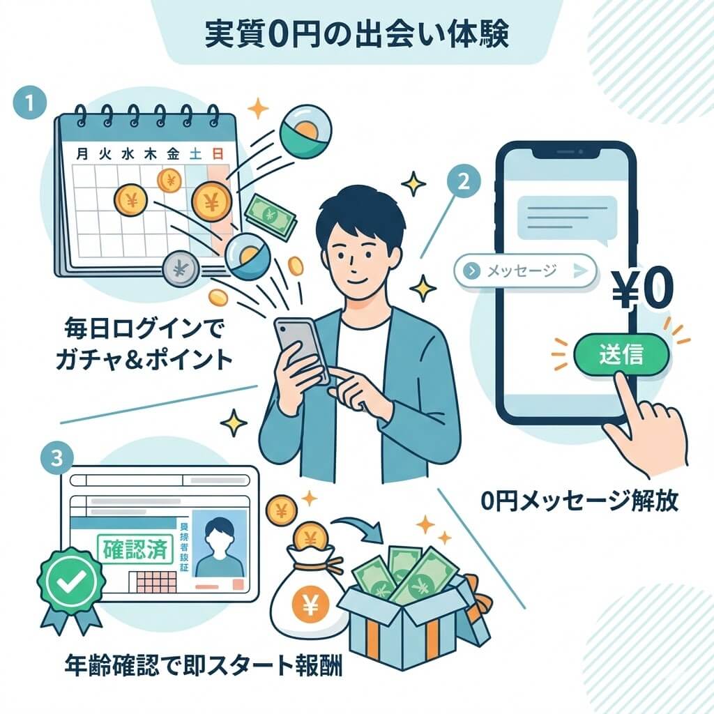 男性は基本有料のポイント制ですが、Jメールにはポイントを無料で獲得できるシステムが用意されています。代表的なのが「ログインガチャ」などのボーナス制度です。毎日ログインすることで少しずつポイントやマイレージを貯めることができ、それらを活用すれば無課金、あるいは微課金でも十分にアプローチの機会を作ることが可能です。また、年齢確認を完了させた際にもボーナスポイントが付与されるキャンペーンを頻繁に実施しています。定額制アプリでは絶対に不可能な「お金を一切かけずにメッセージを送る」という体験ができるのは、Jメールならではのユニークな特徴です。まずは無料でもらえるポイントを使って、サイトの雰囲気を試してみることをおすすめします。