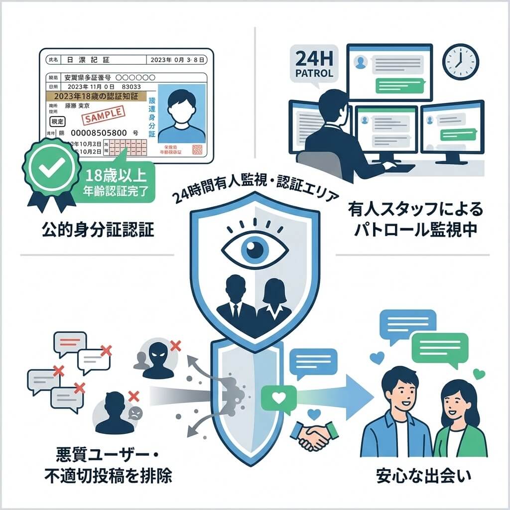 出会い系サービスにおいて最も懸念されるのが「安全性」ですが、Jメールは法令に基づき、公的身分証明書を用いた厳格な年齢確認(18歳以上)を義務付けています。身分証の一部をマスキングして提出することも可能で、個人情報の取り扱いにも配慮されています。さらに、24時間365日体制で有人によるパトロール監視を実施しており、不適切な書き込みや悪質なユーザーを排除する仕組みが整っています。ブロック機能や通報機能も完備されているため、万が一不快なユーザーに遭遇した場合でもすぐに対処できます。長年の運営実績に裏打ちされた盤石なセキュリティ体制があるからこそ、ユーザーは安心して出会い探しに専念できるのです。